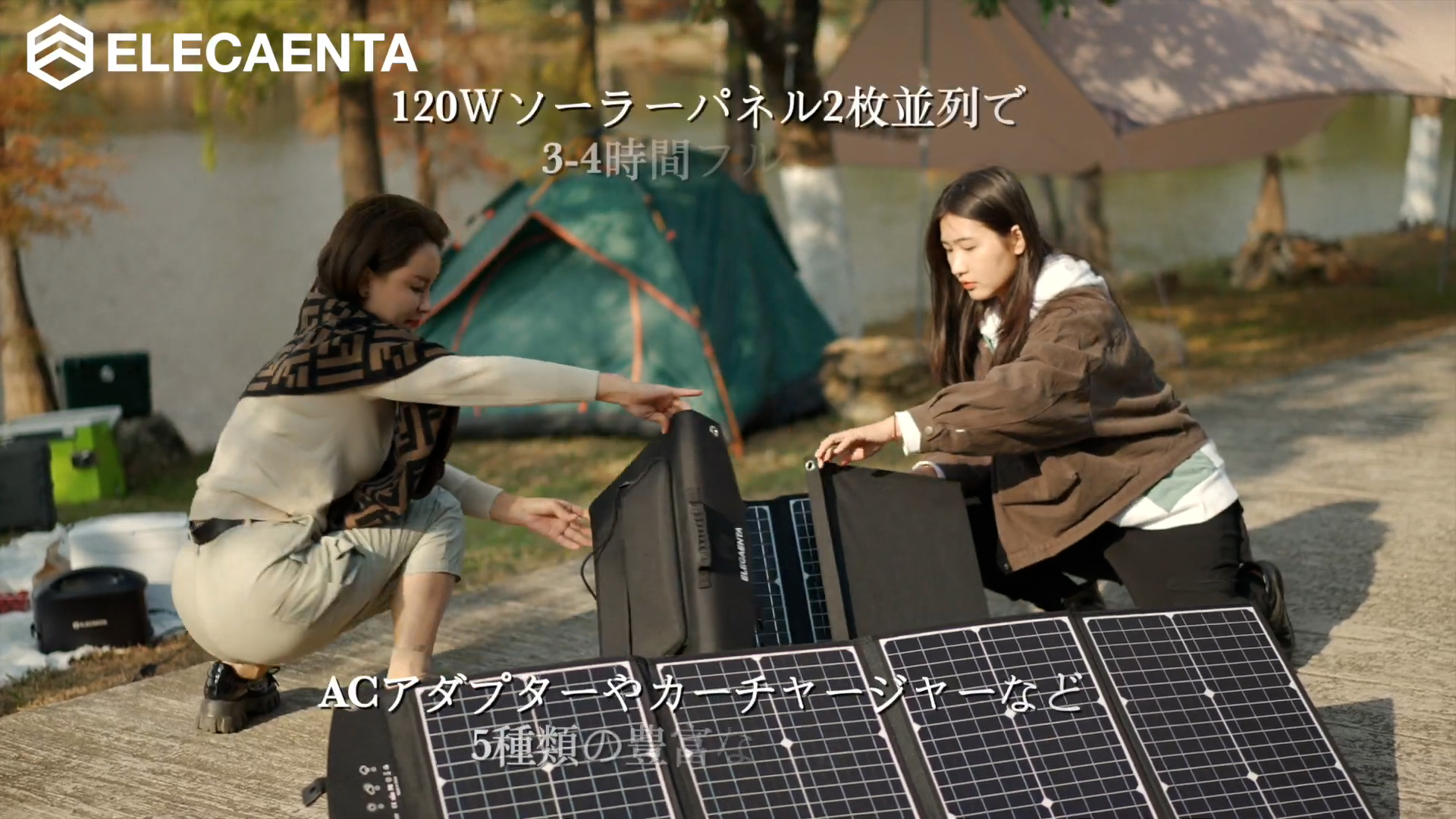 車のバッテリーや折り畳みしきのソーラーパネルなど、場所に縛られずに充電できる。