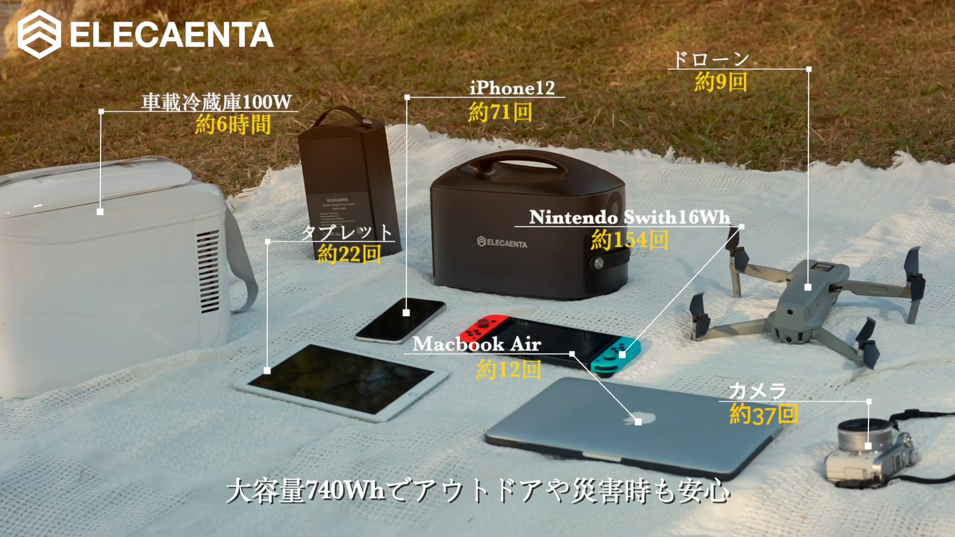 「S600W」の電力容量は740Wh、20万mAh。AC定格600W(最大1200W)の出力やUSBポートなどの最大10口のハブからパソコンやスマホはもちろんのこと、ドローンやカメラなどのレジャー用品に電力を供給してくれる。車載冷蔵庫や車載炊飯器などをカバーしている場合もあるので、キャンプ場で大活躍しそう。50Hzと60Hzを切り替え可能で、使う電化製品の幅も広い。