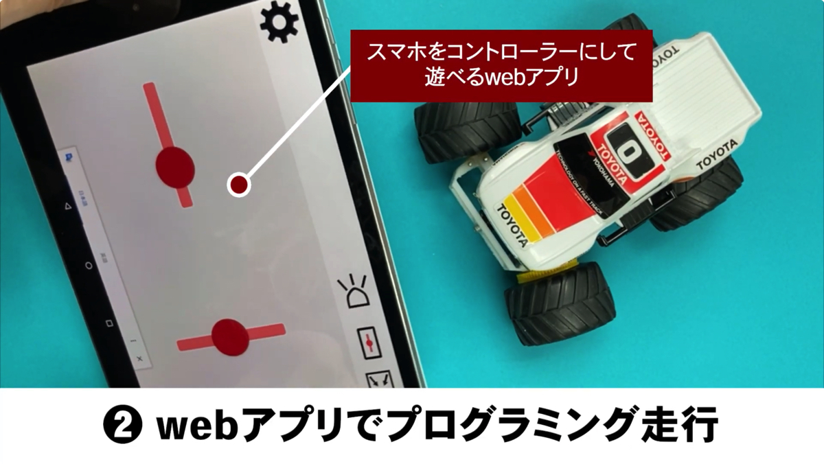 Webアプリにはコントローラーとプログラミングの二つの機能を搭載。標準搭載のコントローラーはシンプルな操作性で、操作感度も自由に調整できる。