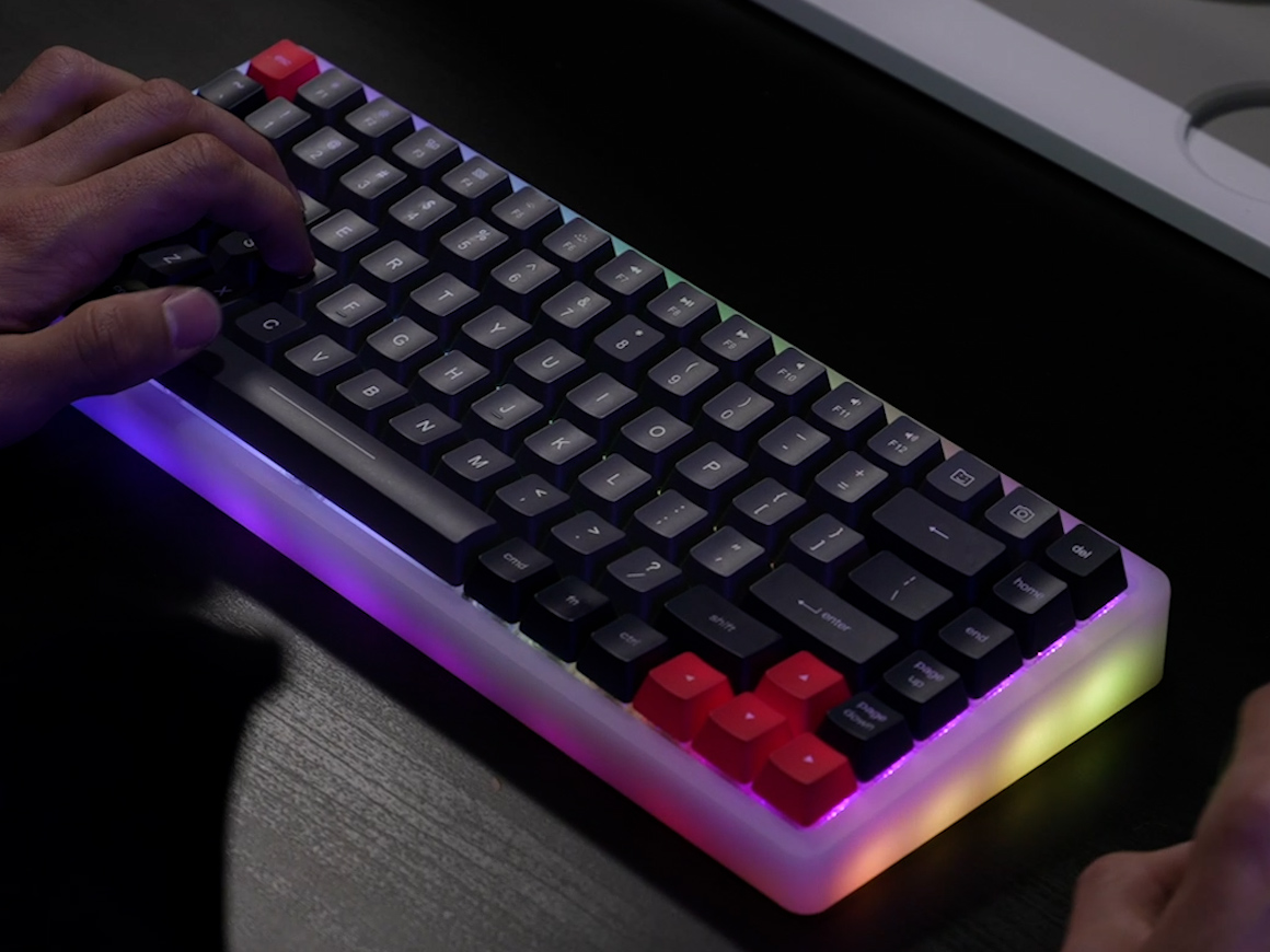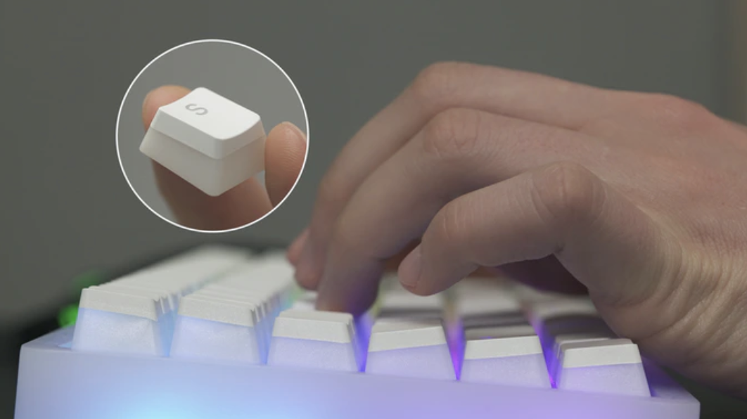 滑らかなキーストロークのために独自にデザインしたスイッチ。キーキャップは、RGBバックライトの光を美しく透過するデザインなどの3種類を展開。キースイッチやキーキャップは、好みに合わせて交換できる。