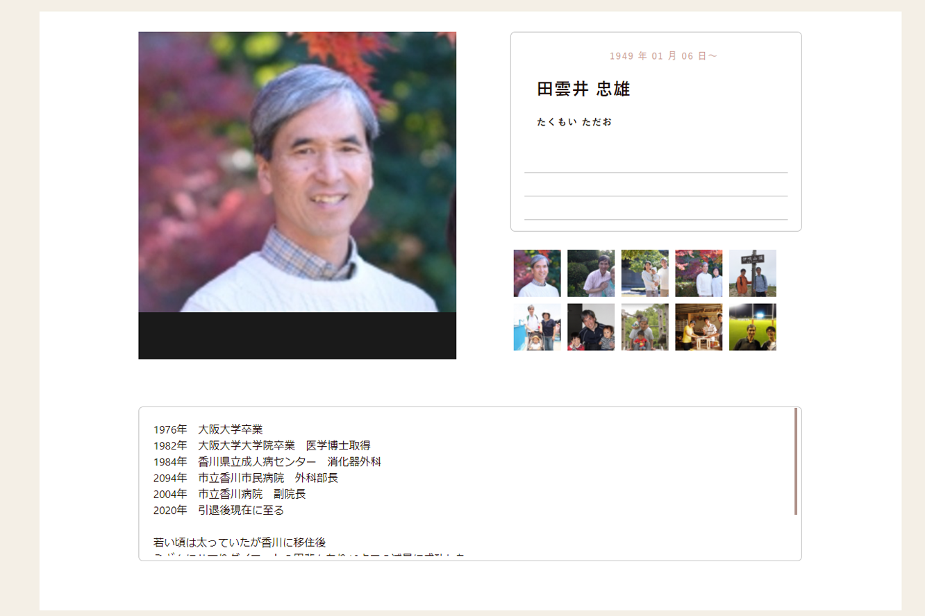 Web上の家系図をクリックすると上記の画像のような個人のページが表示されます。そこには経歴や未来に伝えたいことなど、自分のことを何でも記載できます。また、写真も複数枚登録できます。