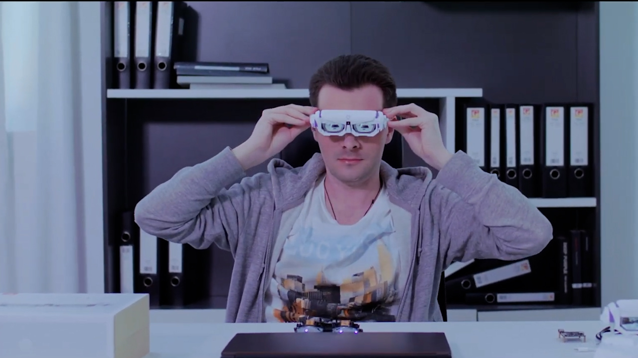 Mutrics ARiCはARグラスと開発環境が整備されたプロダクト。グラスをかけると、そこに広がるのは体感120インチ、フルHD、視野45度の大迫力画面が味わえる。