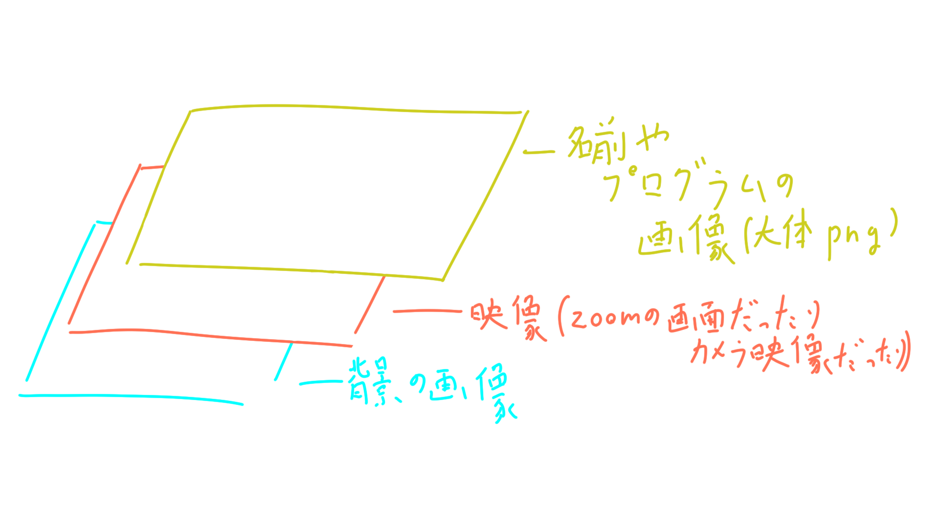 背景の宇宙であったり、お名前のテロップなんかがPNGの画像になっています。こんな感じの階層構造で配信画面を作ることができるのが、OBSの強いところです。
