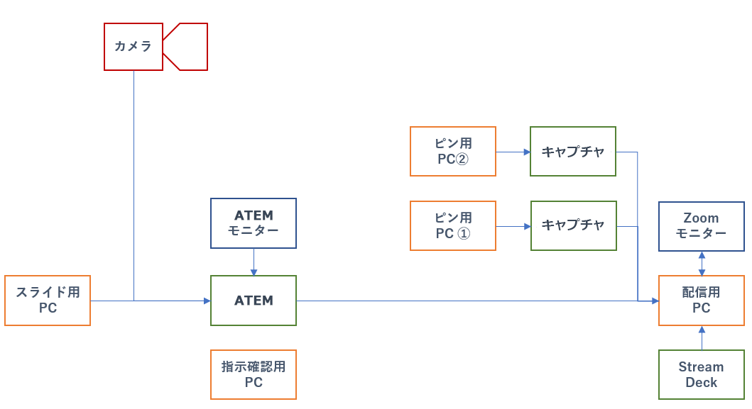 今回はスライド用PCを接続する他に、スタジオに用意したカメラの接続も行っています。