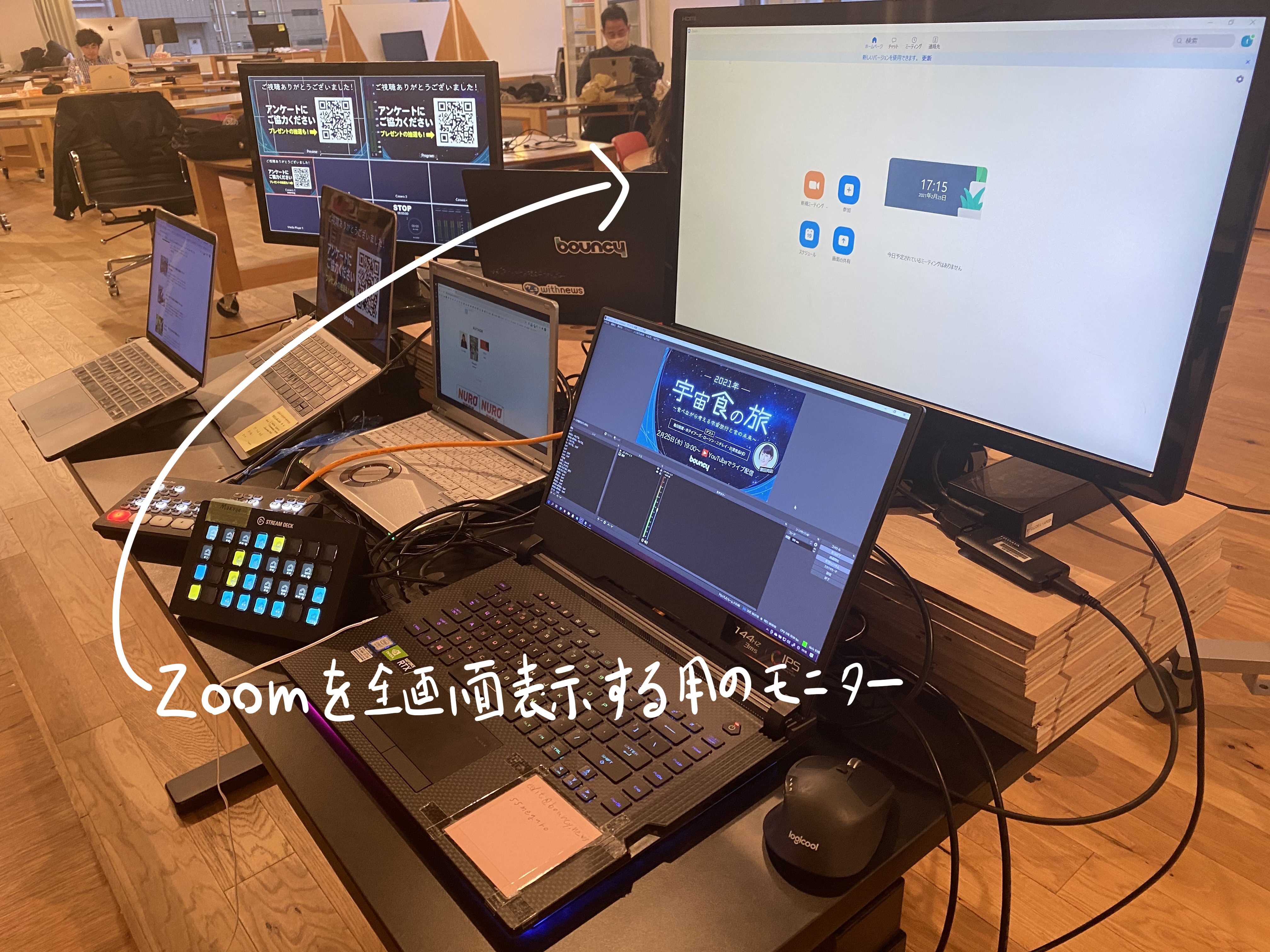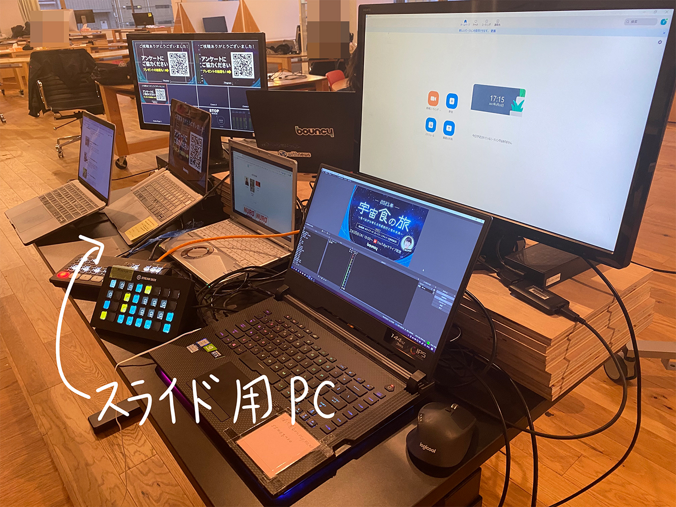 遠隔でZoomに参加して頂いている方もいるので、指示はSlackで流れてきます。それを確認する用のPCです。