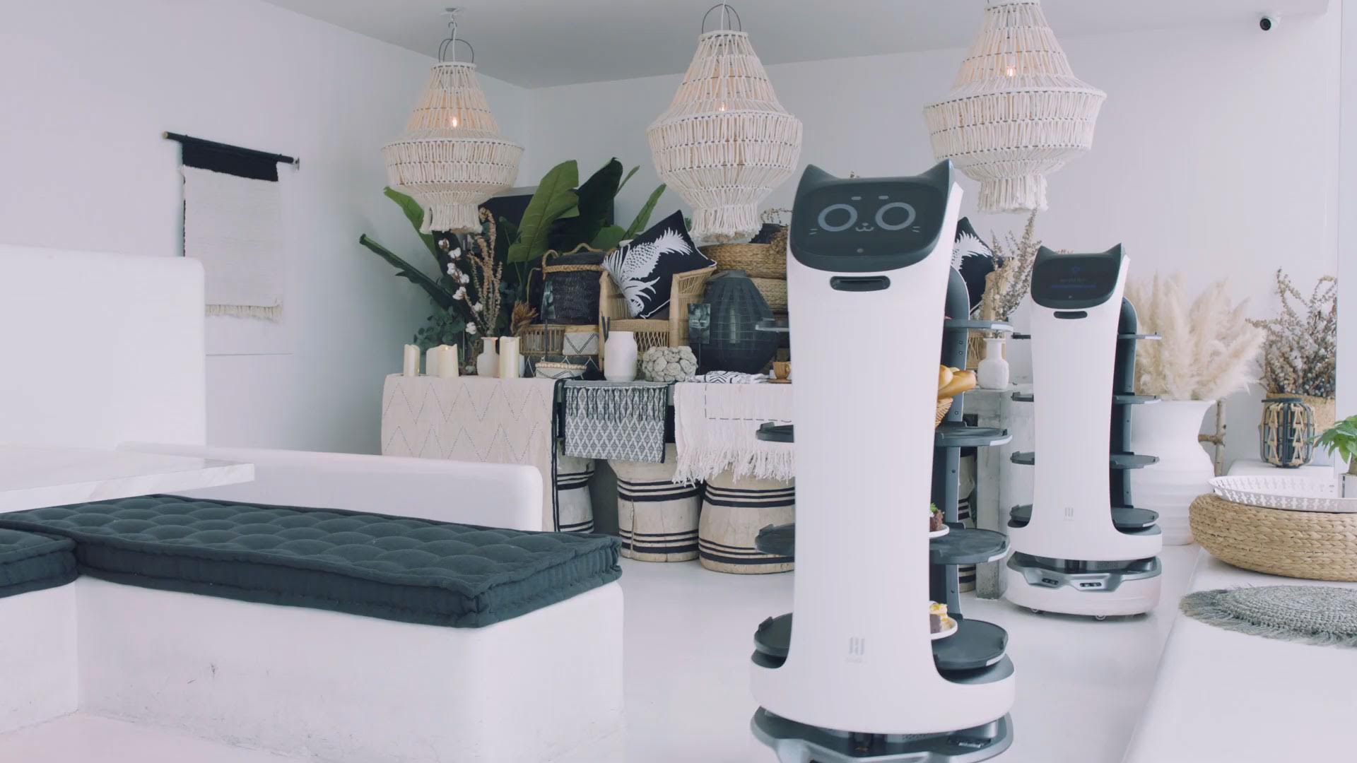 「BellaBot」は飲食店での回転率やサービスの向上を目的に作られた、最新技術を搭載したネコ型の自動配膳ロボットだ。