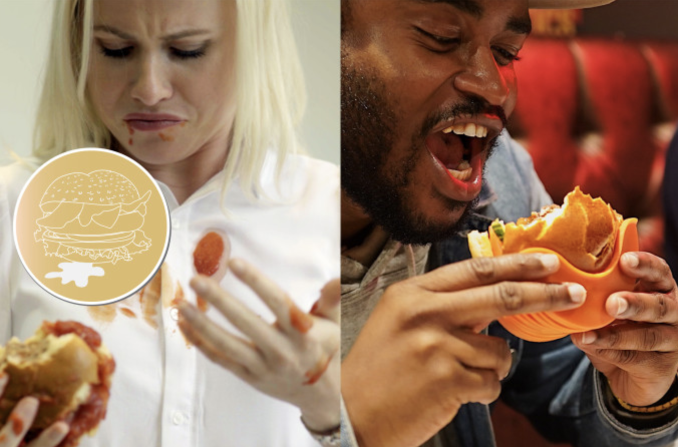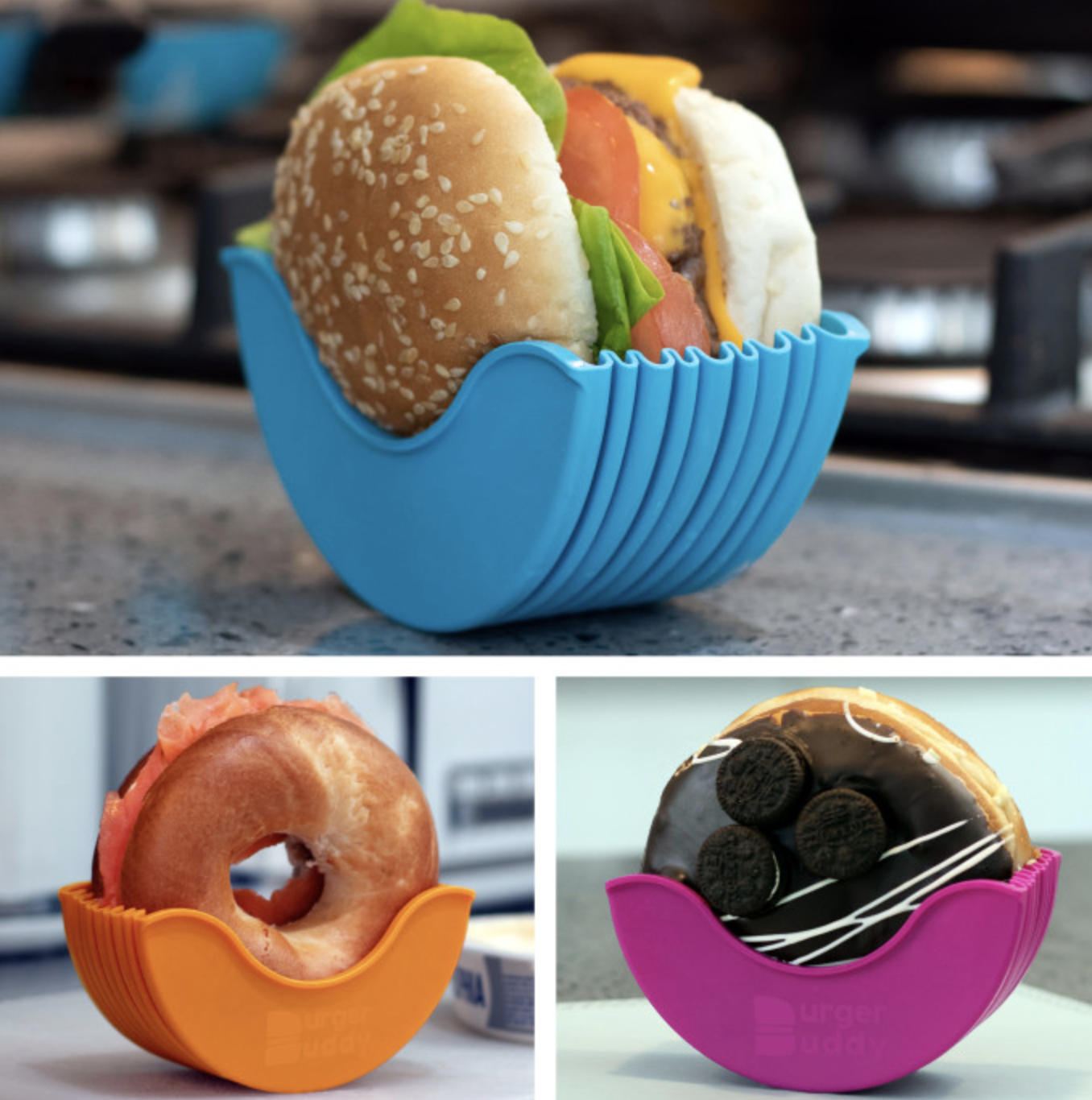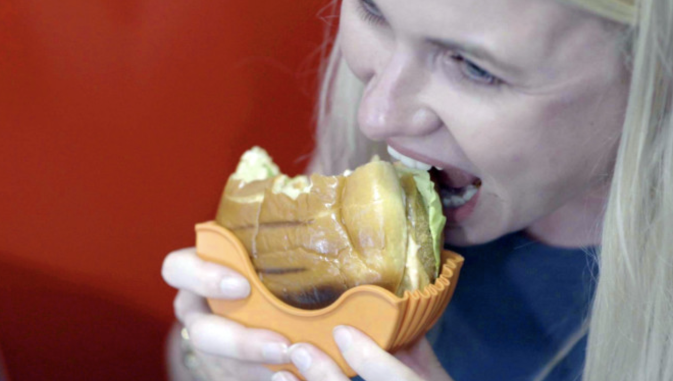 シリコン製の容器の「Burger Buddy」にハンバーガーを入れて食べれば、手を汚さずに食べられます。