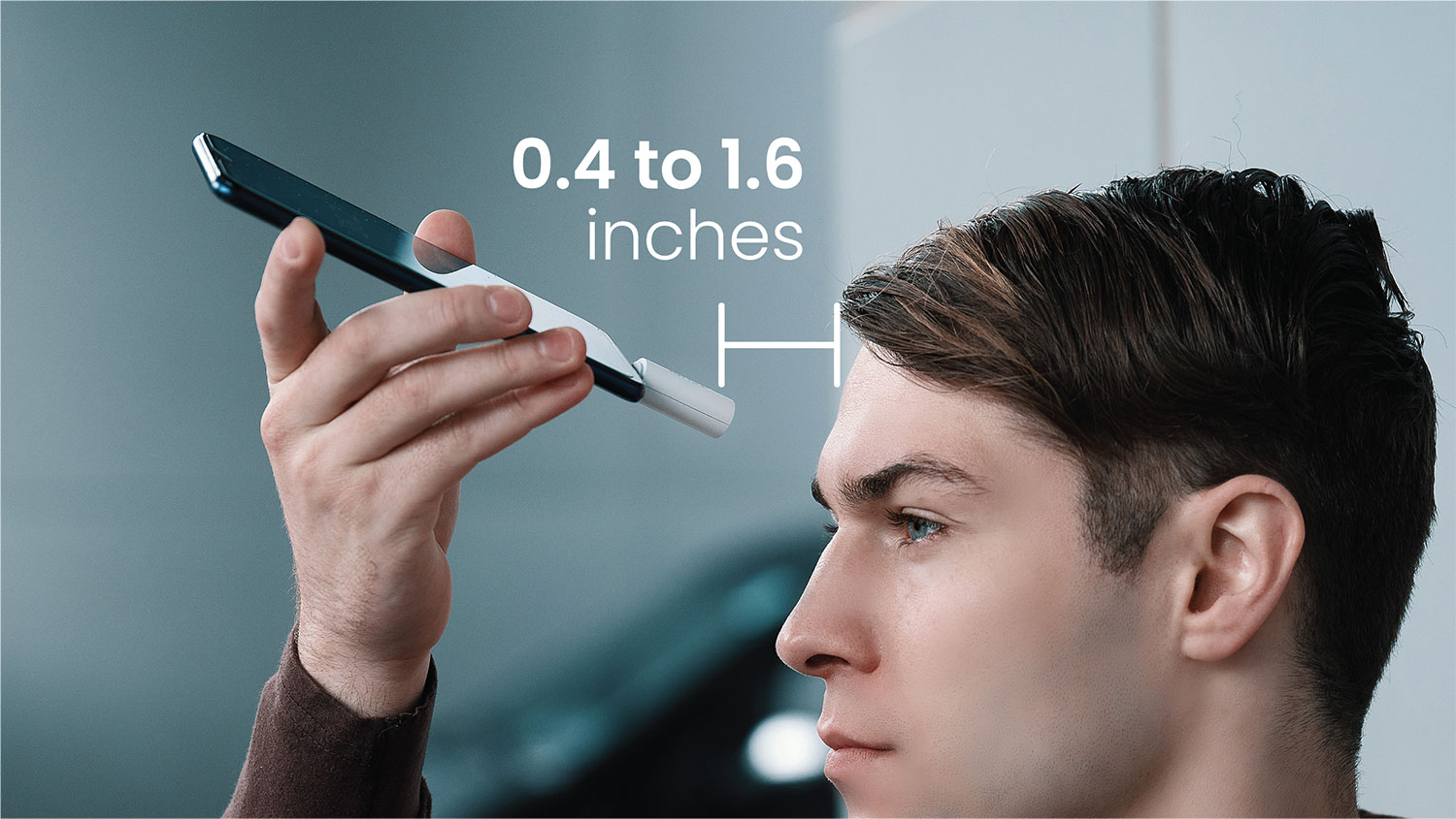 おでこから0.4〜1.6インチ(約1cm〜4cm)ほど離し、約2秒待つだけ。測定結果がスマホに表示される。短時間で測定できるので、子どもの体温測定にもぴったり。