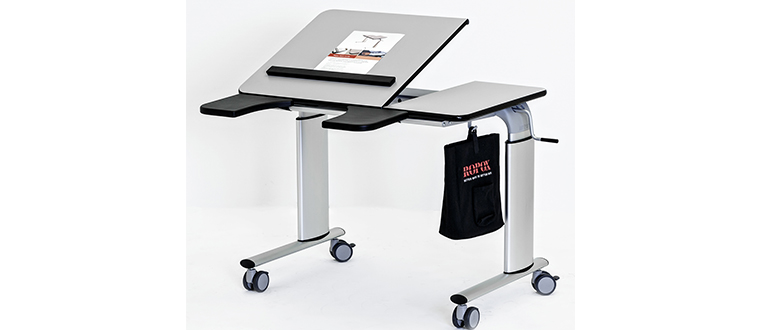 車いす利用者やベッド上で作業したい人のためにも、机の脚の長さや幅を十分にとっており、高さ、幅、傾斜まで細かく調節できるようになっている。