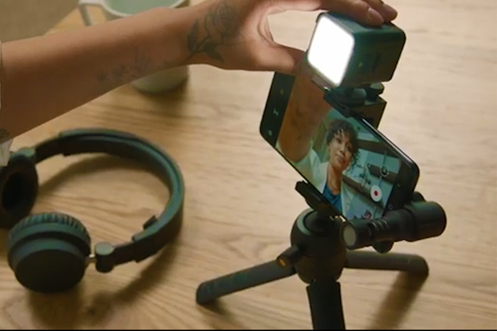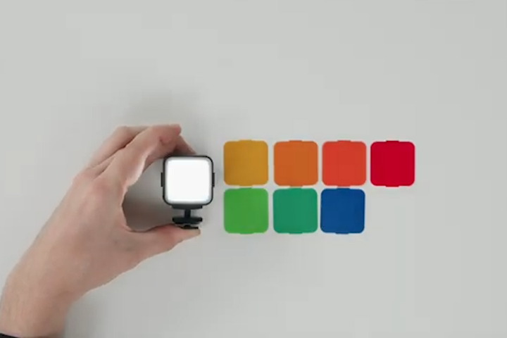二つ目はLEDライト。スマホにもライトが付いていますが、インカメラだと使えないなどちょっとした不便もあります。その点、キットのライトは外付けなので自撮り撮影でも明るく照らしてくれます。また、8色のフィルターも付属しているので、映像表現の幅が広がります。