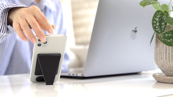 スマホホルダーとして使う際は、中指を通し引っ掛ける、薬指を添える、ボディーを掴むだけで、今までにないグリップ力と人の手に吸い付くようなフィット感で、スマホを落として破損させるリスクを低減する。