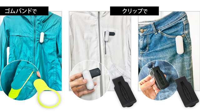 付属のクリップやゴムバンドを使って、ランニングウエアやアウトドアウエア、制服、リュックサックから犬のハーネスに至るまで、様々な所に取付できる。