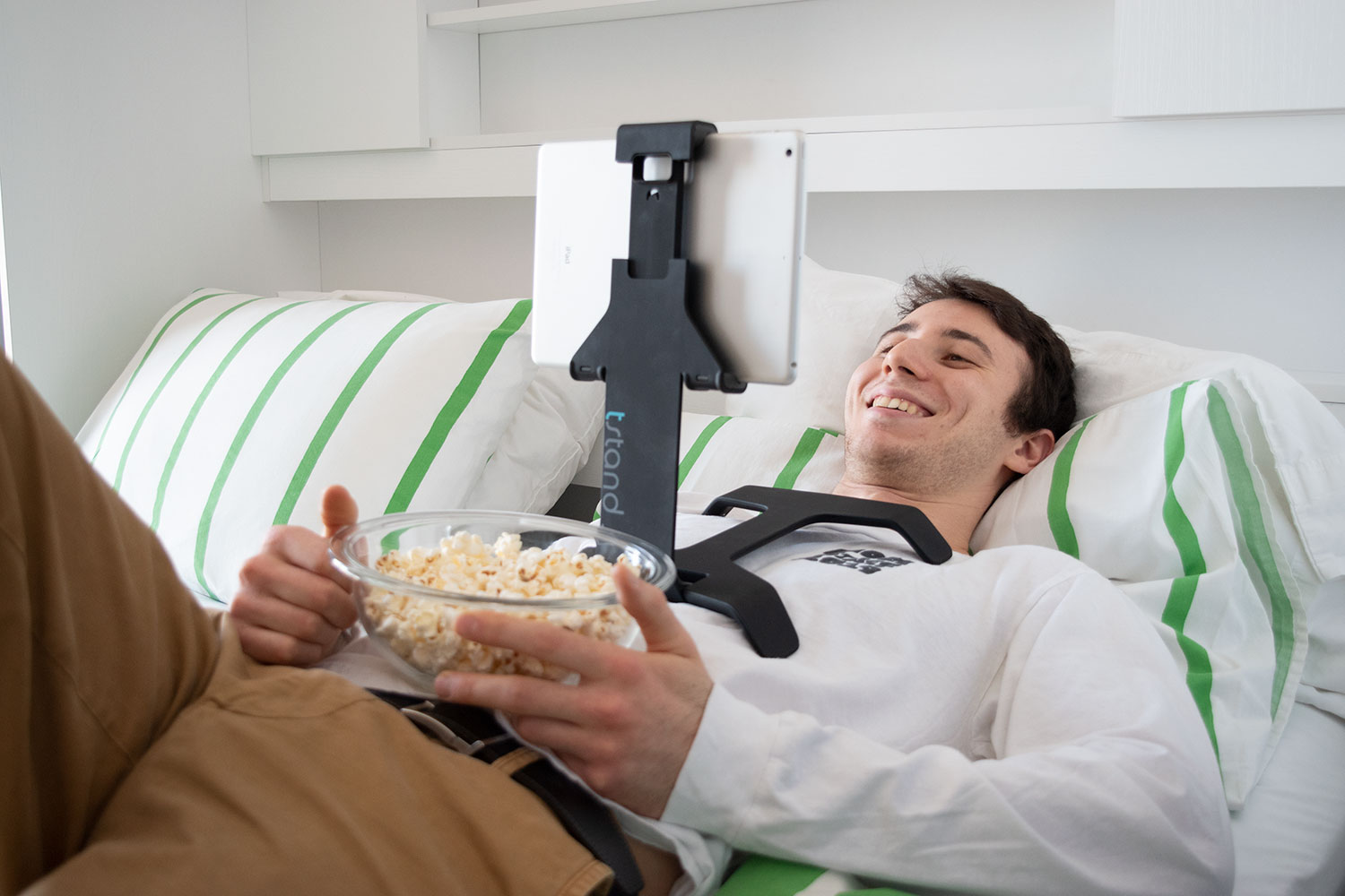 「TSTAND 2」ならスマホやタブレット、Nintendo Switchなどの携帯ゲーム機などさまざまなデバイスを固定でき、仰向けに寝転びながら動画やゲームを楽しめる。人をダメにしてしまいそうなスタンドだ。