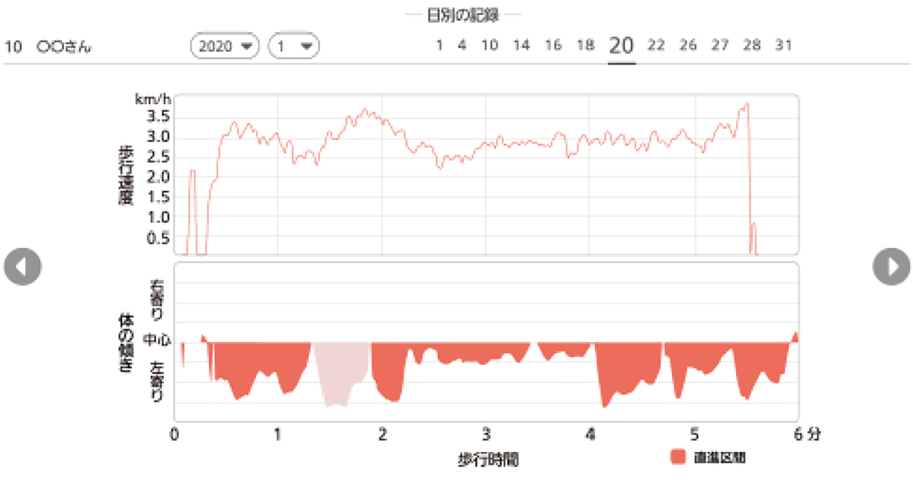 さらに、歩行速度・歩行距離・左右バランスなどのデータをリアルタイムでデータベースに蓄積。定期測定よりも細やかに状態変化を把握できる。