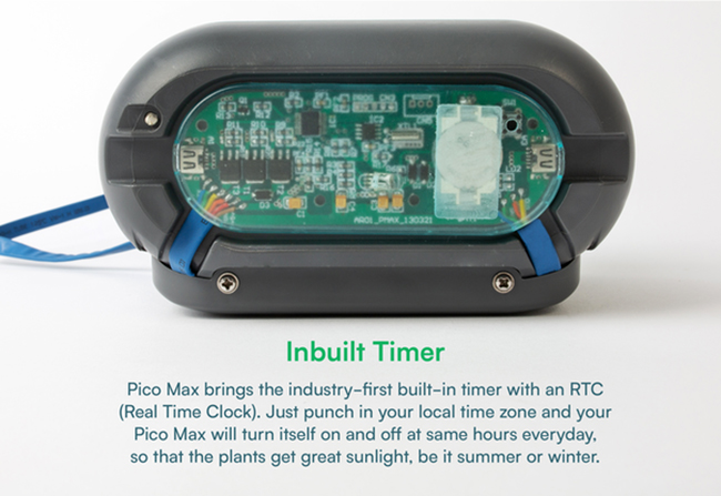 さらに「Pico Max」はRTC(リアルタイムクロック)のタイマーを内蔵し、タイムゾーンを入力するだけで毎日決まった時間に光を照射できるようになっている。
