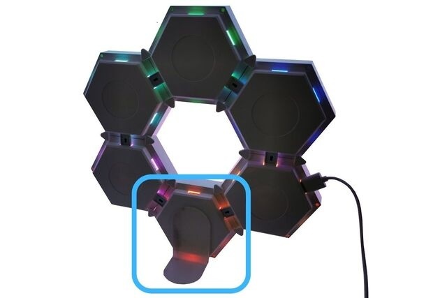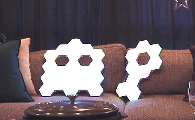 「STAGE MUSIC」は9cm×10.3cmの六角形のパネルで、付属の接続チップで好きな形に結合できる。壁に貼り付けたり、ソファにおいたり、寝室においたり。場所に合わせ、光の色と発光パターンを選べば、部屋の雰囲気をコントロールできる。