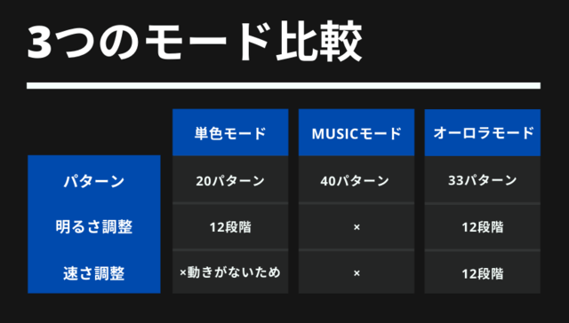 「STAGE MUSIC」は発光パターンが3つあり、切り替え可能。カラーバリエーションは最大8パターン。明るさ・速さは最大12段階まである。