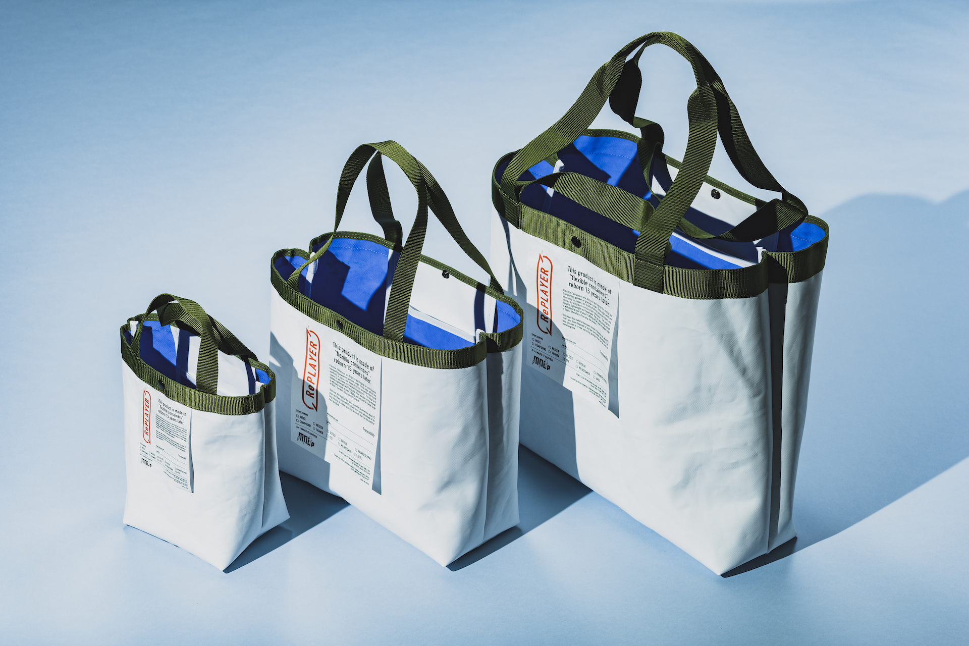 実際に粉体や粒状の貨物輸送で使用されていたフレキシブルコンテナを再利用したトートバッグ。約1tの荷重にも耐えられる強度を誇る素材だから、10〜20年は優にもつという。