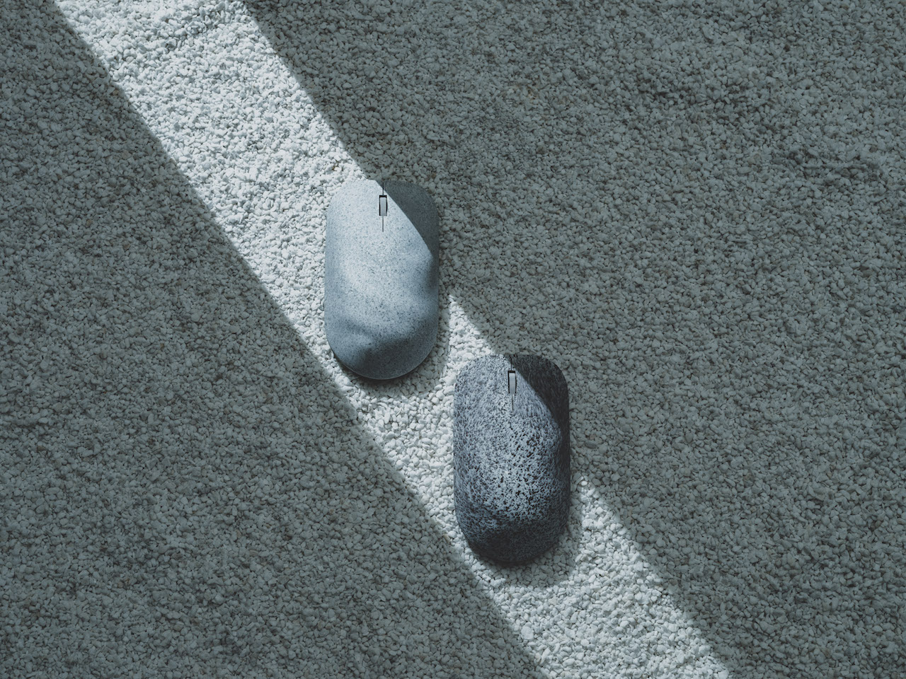海水から抽出したミネラル成分から生まれたプラスチック「NAGORI」を使ったマウス。樹脂の常識を覆す陶器のような質感と熱伝導性を併せ持つ。