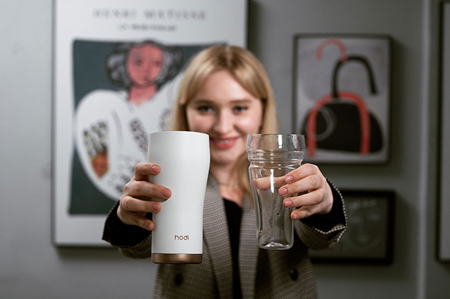 「hodi」は、ガラス製のグラスとセラミック製のマグが入れ子構造になっているタンブラー。グラスは12オンス(約350ml)、マグは16オンス(約470ml)の容量だ。