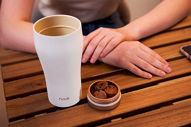 「hodi」は、グラスとマグを入れ子構造にするアイデアがおもしろい製品。保温・保冷に対応し、フタのロックも頑丈で中身はこぼれない。シチュエーションを選ばず使えるマイタンブラーとして活躍してくれそうだ。