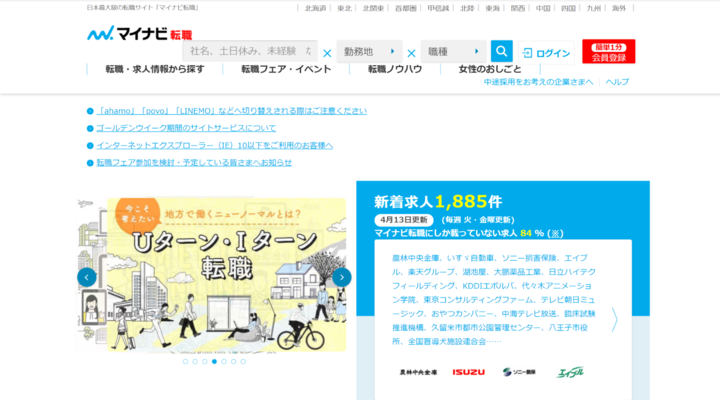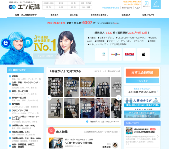 転職希望者なら真っ先に思い浮かぶ、知名度抜群の大手転職サイト。何といっても求人数が抜群に多いのが強みです(2021年4月13日時点 48,886件)。