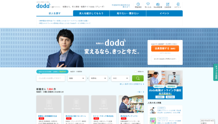 dodaが他の求人媒体と異なる点は、転職サイトと転職エージェントが一体化していること。そのため求人の管理も一括化されており、掲載求人数だけで見るとかなりのボリュームです(2021年4月13日時点 110,557件)。