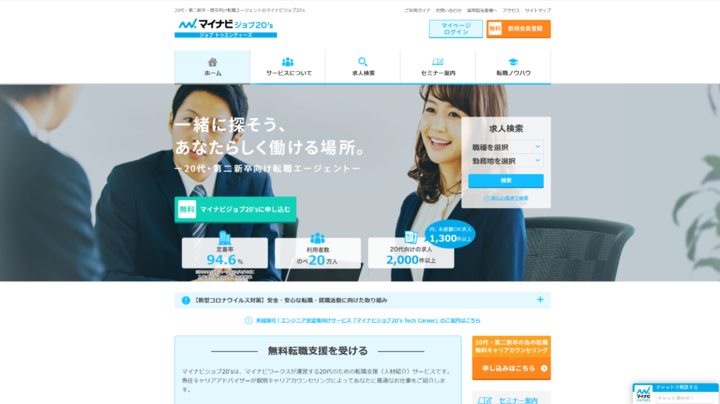 マイナビジョブ20'sは、その名の通り20代の転職者向けに特化したエージェントサービス。通常の転職サイトには掲載されない非公開求人など、人気のレア求人に巡り合えるチャンスも多いです。
