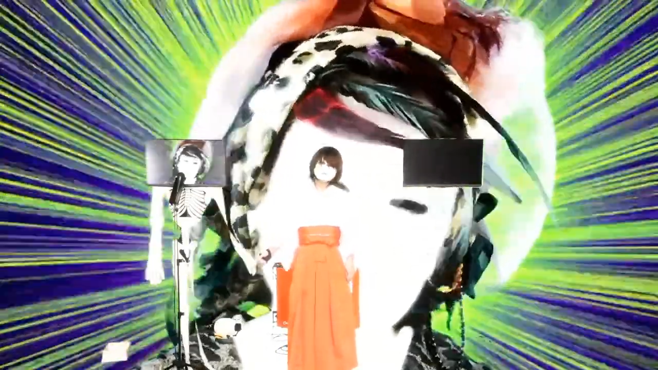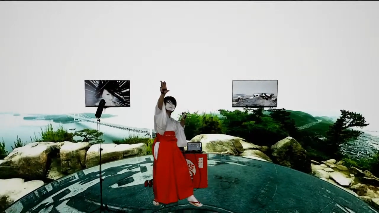 ライブパフォーマンスは巫女さんの格好をしたOmodakaさんの横に液晶ディスプレイが2台あり、音楽に合わせてモーショングラフィックスや、民謡歌手が登場したり、