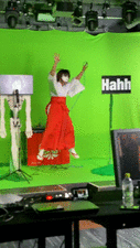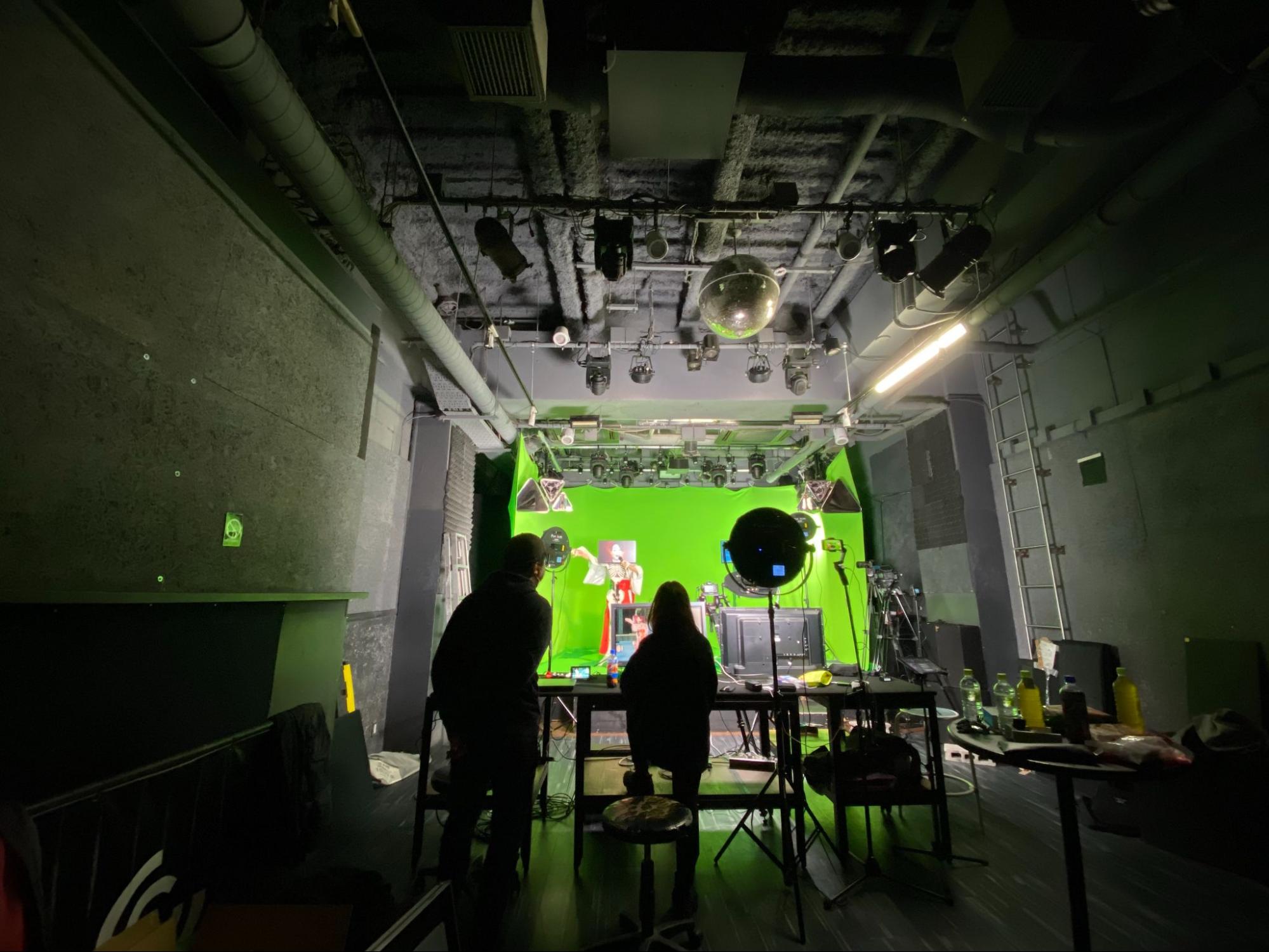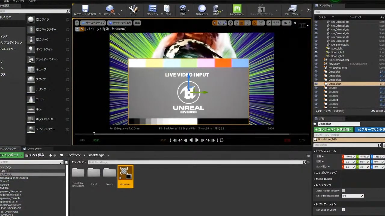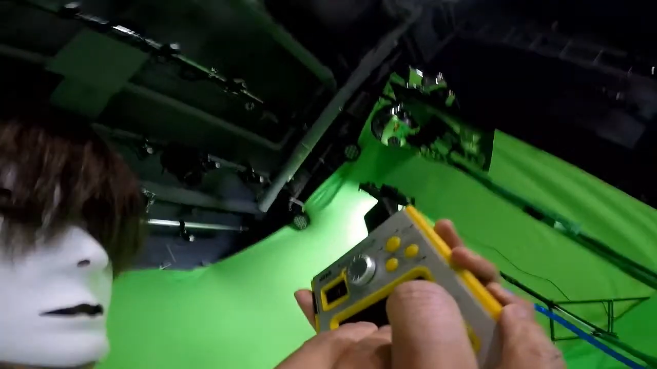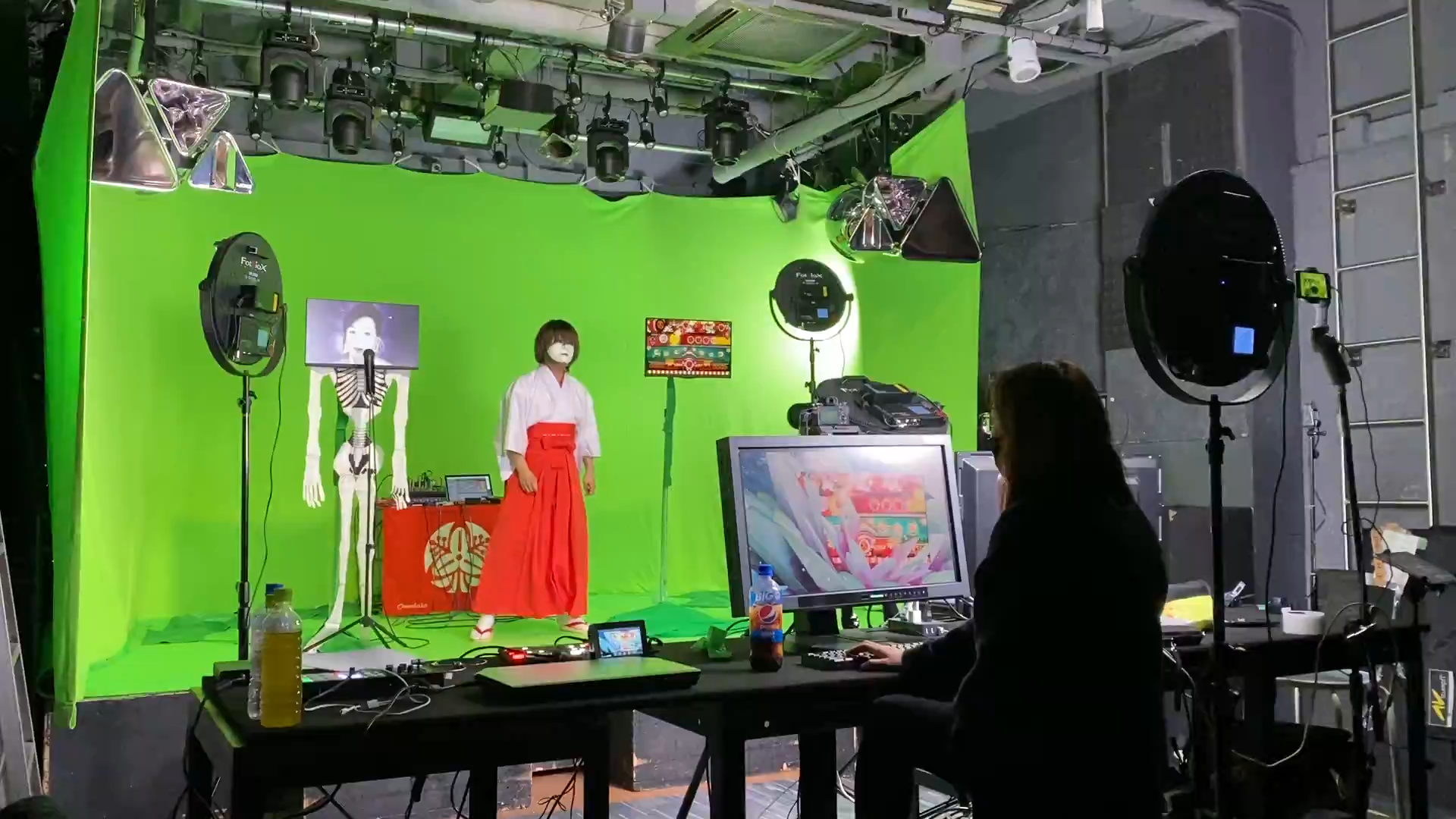 今回のVRのシステムを簡単に説明すると、Omodakaの後ろにグリーンバックがあり、そこにフラットに照明を当てて、カメラで撮影したものをUnreal Engineというゲームエンジンに取り込んで、グリーンのところだけを抜いて合成したという感じです。
