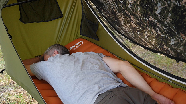 一般的なハンモックは横になった際に腰の部分が大きく沈むのに対し、「ヘブンテント」は独自のフルフラット設計によって、完全に並行な状態で横になれる。