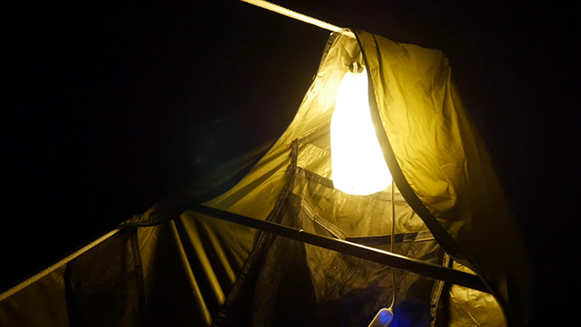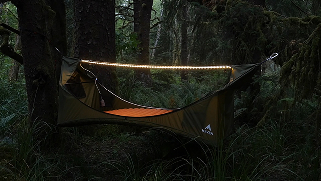 テープ型LEDライト「Ridge Light」は、上部に伸ばして設置するとハンモックの周囲を明るく照らしてくれる。