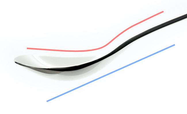 これはスープと具材を乗せたスプーンが、顔の正面から45°の角度で口へ入りやすいよう設計されたもの。斜めに口に入る動きがもっとも自然で、かつ見た目も美しいという実験結果に基づいている。