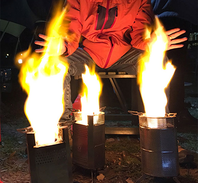 「ORIGINAL-ENERGY」は、空気が循環しやすい構造で、薪や木の枝などの身近な材料を使って効率よく、素早く火をおこせる。