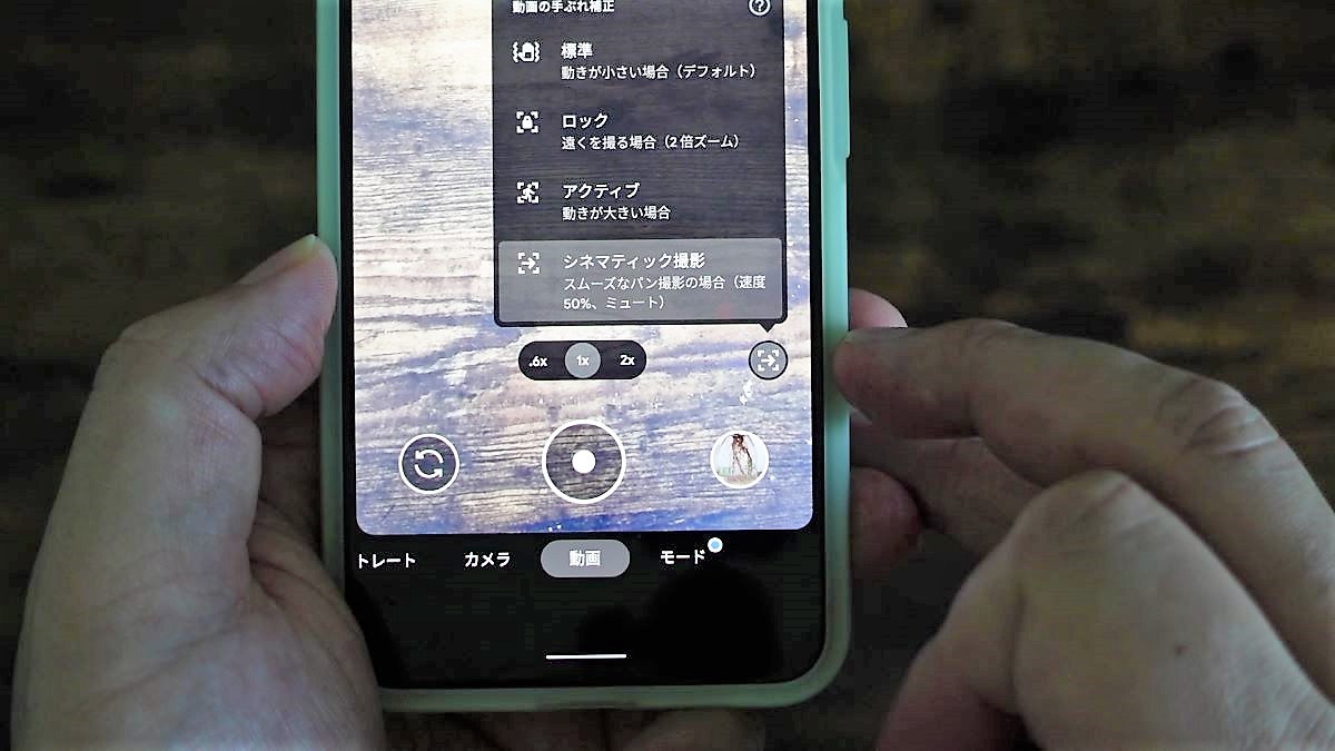 そうした中でも拍手を贈りたいのが、手ブレを抑えてスローモーション撮影できる「シネマティック撮影」機能。雰囲気のある動画が手軽に撮影できます。