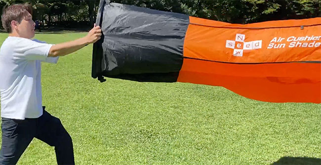 膨らませ方も簡単。吸気口を広げたら、鯉のぼりが風になびくようなかたちで空気を取り込み、吸気口のバックルを閉めるだけ。息を吹き込んだり、足でエアーポンプを踏み続ける必要はないから楽ちん。わずか数秒で完成する。