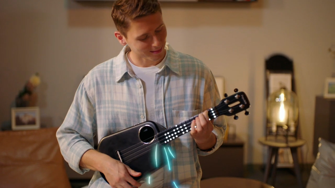 「Populele 2 Pro」は、フィンガーボードの光とアプリが連動し、楽しくウクレレが学べるスマートウクレレ。本体フィンガーボードには56個のLEDライトが仕込まれており、指の動きを光で示す。専用アプリがこの光と連動することで、インタラクティブにコードや演奏を学習できる。