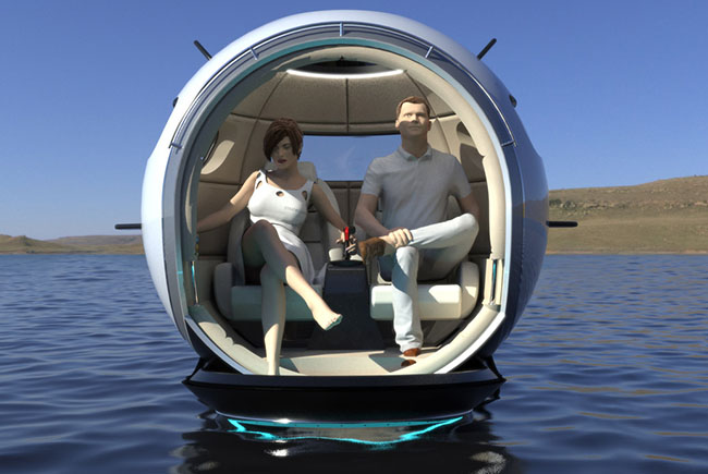 ボディは直径1.65メートルの超軽量炭素繊維でできた球形の二人乗りで、150馬力の電動ツインジェットエンジンと、揚力を上げるための水中翼を搭載。