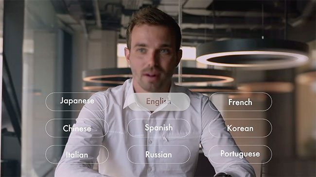 「AI通訳」は人工知能を用いて、音声と映像を同時通訳するシステム。自分が話した言葉を他言語にリアルタイム翻訳し、相手に伝えられる。と同時に自分の映像までリアルタイムで書き換え、まるで他言語を話しているかのような姿を見せられるという。