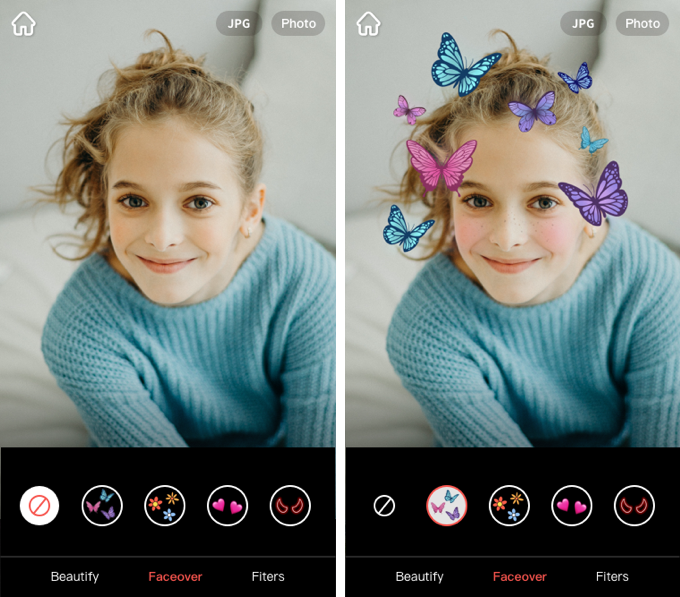 ビューティーモードを使用すれば動画や写真をレタッチでき、フィルター機能を使えばステッカーで彩れる。