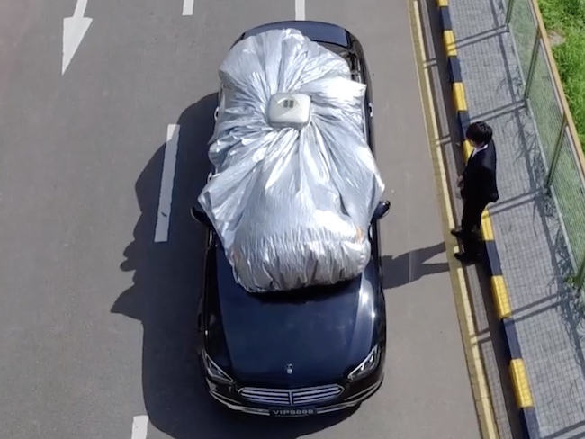「Vinoya」は軽量コンパクトなケースで、車の天井に置くだけ。そして、リモコンボタン一つで自動的に展開される。たったの30秒で大体どんな大きさの車もカバーできてしまうというから驚きだ。