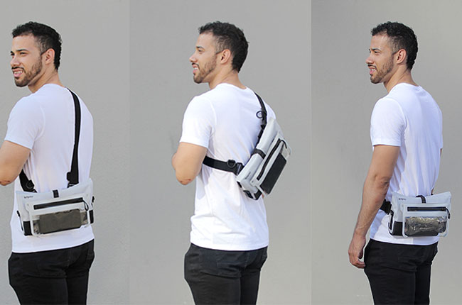 メインバッグと調整可能なストラップ、交換可能なフロントバッグで構成されている。肩掛け、メッセンジャー、またはウエストバッグなどとして使える。