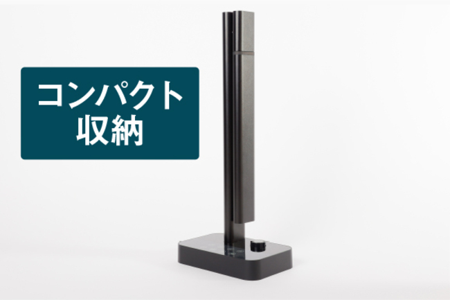 使用していない時はデスクライトとしても活用できる。印刷物を載せる台の大きさは、縦500mm、横510mm。コンパクトでスタイリッシュなデザインなので、手狭なオフィスや会議室でも邪魔にならない。さらに小さく折り畳め持ち運びも楽々。