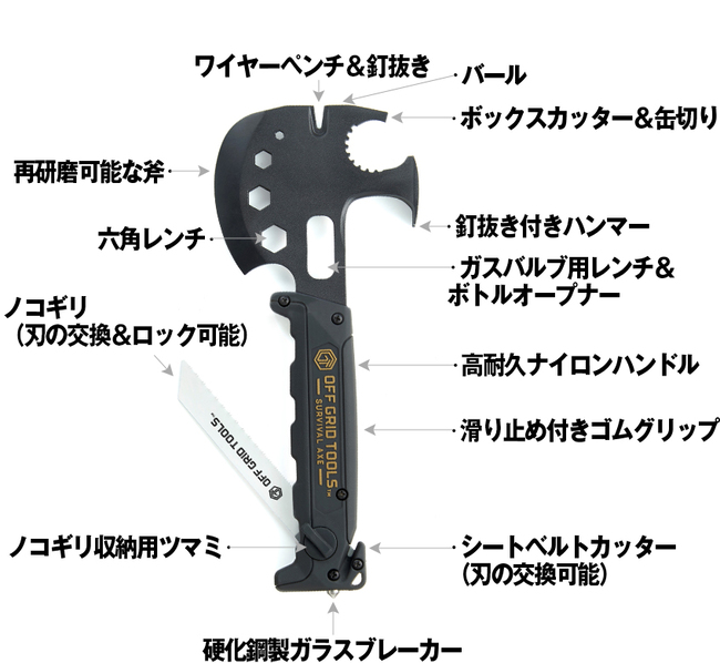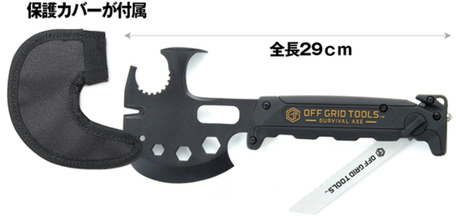 ワイヤーペンチ、釘抜き、バール、ボックスカッター、缶切り、ハンマー、ボトルオープナー、ノコギリ、六角レンチ、斧など31個の機能を持つ。キャンプだけでなく普段の日曜大工、避難生活時にも役に立つという。車内に閉じ込められた際はシートベルトカッターやガラスブレイカーで脱出できる。災害用バッグにいつも入れておけば安心だ。