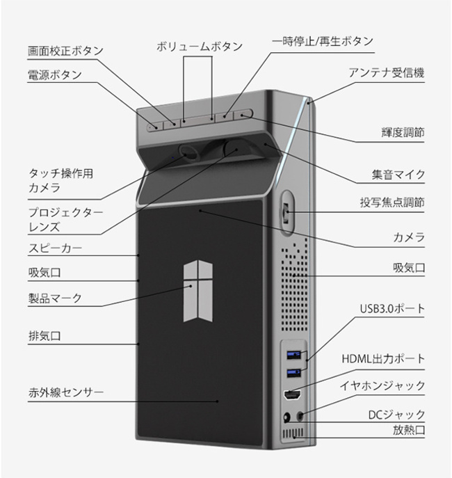 卓上モードで23インチ、壁面モードで23-100インチ(推奨画面サイズ40-60インチ)の大画面で投写できる。入力信号は4k(3840×2160)対応で、1280×720PのHD高画質。高輝度200lmで明るい部屋でもはっきり投写できる。