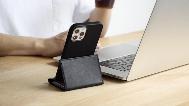 「STAND WALLET mini」は、できる限り無駄を削ぎ落としたコンパクト革財布。カード収納に特化しており、お札1枚とカード3枚が収納できる。またスマホスタンドとして使えるという、遊び心あるデザインを採用。毎日持ち歩くスマホと財布を相性良く使いこなせるアイテムだ。