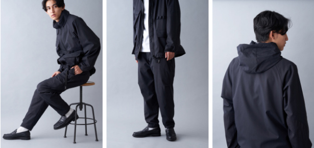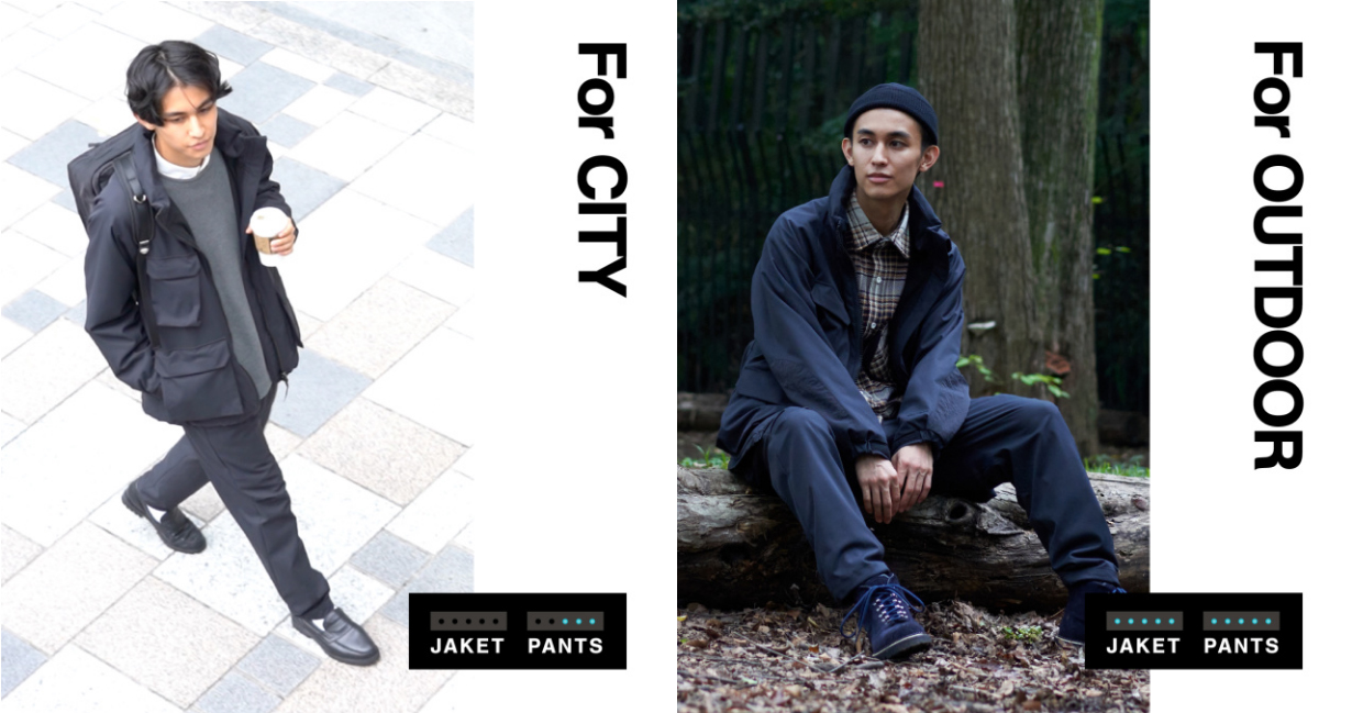 ジャケット・パンツ共にアウトドアメーカーWILD THINGSのウェアをベースにしたデザインで、アクティブシーンでは勿論のこと仕事やタウンユースでもオシャレに着こなせそう。