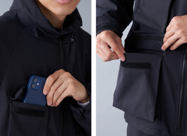 ジャケットには収納フードや袖口アジャスターがついており防寒対策も万全。複数のマルチポケットが配備され収納力も高く、アウトドアやカバンを持たない時のタウンユースにも便利に使えそう。