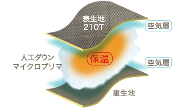 それでいて、天然素材のダウンに劣らない快適な使い心地を実現。絡み合った超極細の繊維が中の空気を動かさずに閉じ込めるため、温かさがしっかり持続する。