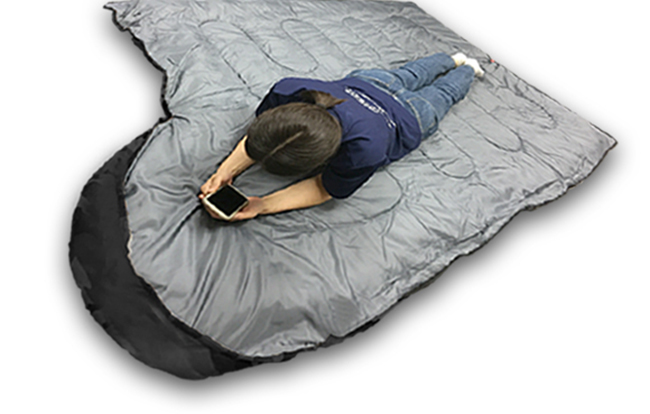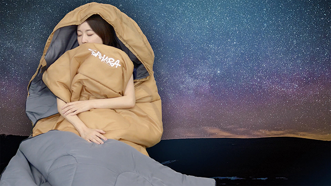 通常の寝袋より横幅が15cm広いワイドサイズで、寝返りや足を曲げるのもラクラク。体格が大きい人も快適に使える。